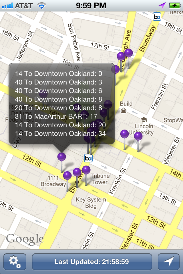 Now free for the month of November!A simple, but straightforward, location based application that identifies Alameda-Contra Costa Transit bus stops with next bus predictions. Location can be determined by location services, or by your own map navigation.Bus information provided by the Next Bus API.In-app purchase available to remove ads.